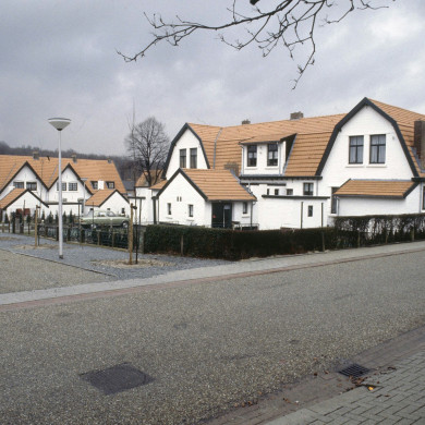 Rechthoekig blok van vier woningen zonder verdieping onder zadeldak gedekt met pannen; de eindwoningen hebben aan de voorzijde en de middenwoningen aan de achterzijde een insteekkap (zadeldak) tegen puntgevel, waarin twee getoogde vensternissen met elk twee rechtgesloten 6-ruits draairamen; de ei