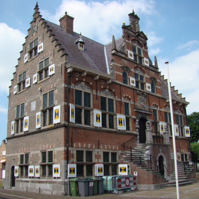 STADHUIS. In 1621 naar ontwerp van Melchior van Herbach en met subsidie van Prins Maurits gebouwd, gerestaureerd in 1910. Rechthoekig gebouw van gele en rode baksteen, met natuurstenen vensterkozijnen, plint, banden, blokken en sierstukken, gedekt door een hoog leien dak tussen twee trapgevels en boven het front, een topgevel. Voor de ingang een bordes. De vensters gedekt door strekken, segment- en korfbogen; in de boogtrommels van de voorgevel natuurstenen cartouche-versieringen. Boven de natuurstenen ingangsboog een cartouche met het stadswapen in omlijsting met fronton-afdekking. De geveltop aan de voorzijde rijk versierd met banden, lijsten en twee sierankers, met vier klauwstukken, twee gebroken frontons, twee obelisken en twee stenen: Anna 1621. In de top een Justitiabeeld op consoles voor een nisvormige omlijsting. Houten goot op klossen (1628). Onder het bordes een natuurstenen poortje, en soortgelijk poortje in de noordelijke en zuidelijke zijgevel.