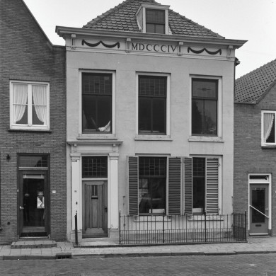 HUIS onder schilddak en met Empire lijstgevel, gepleisterd, waarin door pilasters omlijste ingang, kroonlijst op voluutvormige consoles en versierd met guirlandes, in het midden het jaartal MDCCCIV.