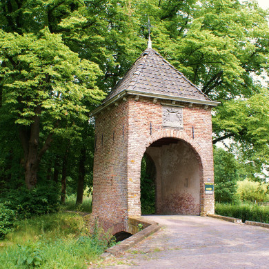 GROENESTEIN, ridderhofstad. Slechts poortgebouwtje op brug met wapensteen achterzijde 1617; tegelijk duivenslag, bouwhuis, boerderij XVII zadeldak met rechte kroonlijst.