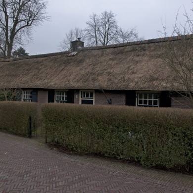 Lage arbeiderswoning onder een rieten zadeldak, eindigend in topgevel.