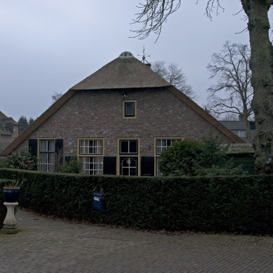 Boerderij, langhuis, rieten dak afgewolfde voorgevel, kleine roeden, halve luiken.