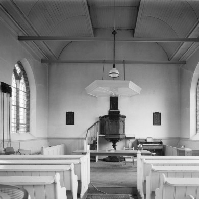 Herv.Kerk uit 1908, vanwege 17e eeuwse eiken preekstoel. Klokkenstoel met klok van P. Overney, 1674, 60 cm.