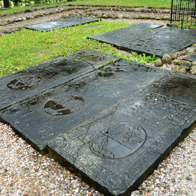 Verhoogd kerkhof door boomsingel omgeven; in de grond aangegeven de grondvesten van het afgebroken kerkje. Groot aantal 18e een 19e eeuwse zerken.