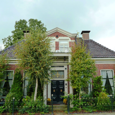 Landelijk pand onder breed schilddak. Halfrond omlijste ingang; zesruitsvensters; in de zijgevel dienstingang; achterste gedeelte onderkelderd. Voor de gevel nog drie hardstenen stoeppalen door kettingen verbonden.