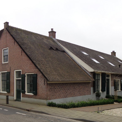 BOERDERIJ, achttiende eeuw, onder zadeldak en met puntgevel, voorzien van vlechtingen.