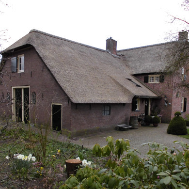 Boerderij, dwarshuis met uitgebouwd kookhuis en oven, pannen/rietendak, XVIII schaapskooi.