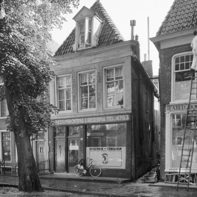 Pand onder zadeldak, voor afgeschuind. Geblokte kroonlijst waarboven dakkapel.