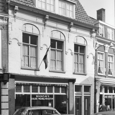 Pand onder vernieuwd dwarsdak; rechte kroonlijst met consoles XVIII B; verdieping ter halver hoogte overgekraagd op telkens een boogje op twee kopjes, XVI-XVIIa.