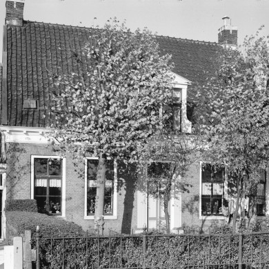 Eenvoudig midden 19e eeuws woonhuis onder zadeldak tussen topgevels. Omlijste deur.