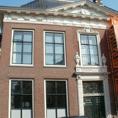 Omlijste ingangspartij met venster erboven; gesneden kroonlijst en tympaan.