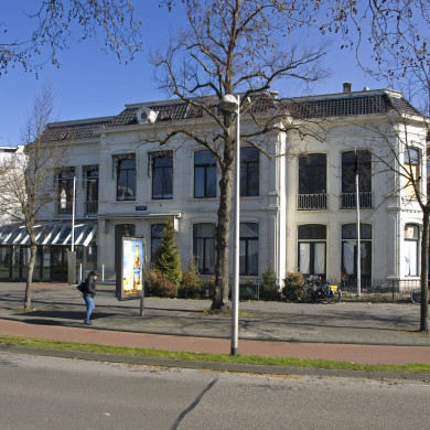 In de stadsuitleg naar ontwerp van Thomas Romein rond 1870 ontstaan twee bouwlagen tellend blokvormig pand onder leien gedekt afgeknot schilddak; witgepleisterd en gedeeltelijk voorzien van getrokken voegen; de gevelvelden verticaal en horizontaal geleed door respectievelijk verdiepte pilasters m