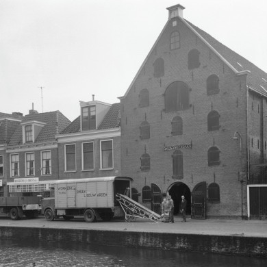 Zeer groot pakhuis. Koningsbergen met puntgevel waarin kleine halfrond gesloten pakdeuren en lichtopeningen XVIII-XIX A.