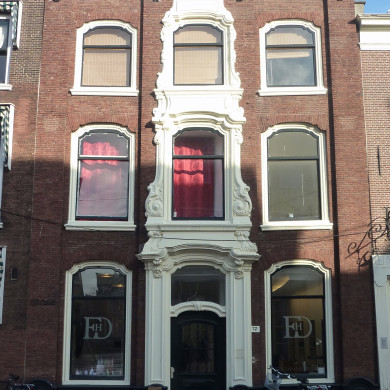 Pand met bakstenen gevel met bewerkte consoles, kroonlijst, mooie onderpui met hardstenen plint, rijkbewerkte middenpartij, omstreeks 1730.