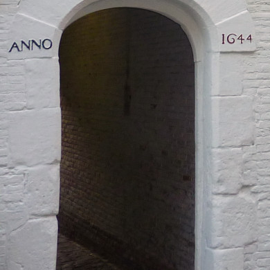 Poortje met zandstenen omlijsting. Anno 1664, achteruitgang van Universiteitsbibliotheek die in 1593 naar Begijnhof overgebracht werd. Waarschijnlijk gebouwd als tweede ingang tot de Engelse Kerk die eveneens hier gevestigd was.