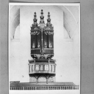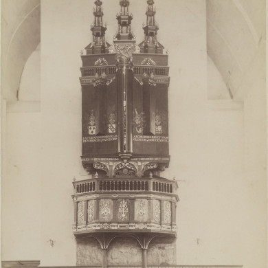 Pomp tegen Hooglandse Kerk, zuiderdwarsschip. Hardsteen, van obelisk bekroning voorzien, 2e helft 18e eeuw.