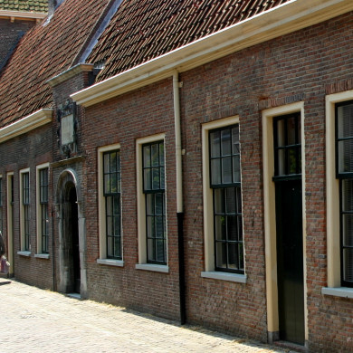 Proveniershuisjes. Lage reeks huisjes onder een rechte gootlijst. Omstreeks 1600.