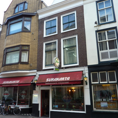Pand met pilastergevel, beneden 5 Ionische pilasters, daarboven Korinthische. Boven de vensters van de eerste en tweede verdieping zandstenen festoenen, rechte kroonlijst, ramen boven hoeken gebogen. 19e eeuw. Aardige lantaarn boven de ingang, 2e helft 17e eeuw. Gevel gerestaureerd 1942.