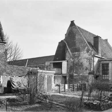 Achterzijde van het Museum van Oudheden "Hof van Zessen". Lange bakstenen gevels met rechte kroonlijst. Hardstenen stoep met palen, 1e helft 19e eeuw, w.o. oude stallen.