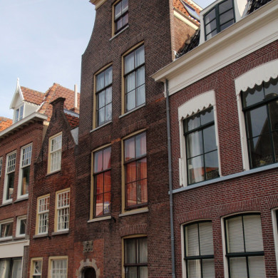 Pand uit de 17e eeuw met verdieping en schilddak, dat achter aansluit tegen een tuitgevel met rookkanaal. De gevels worden afgesloten door houten kroonlijsten. Aan de zijde van de Pieterskerkstraat een karakteristieke winkelpui uit het derde kwart van de 19e eeuw.