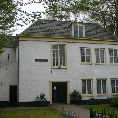 Voormalige pastorie naast de kerk; rechthoekig cremekleurig gebouw.