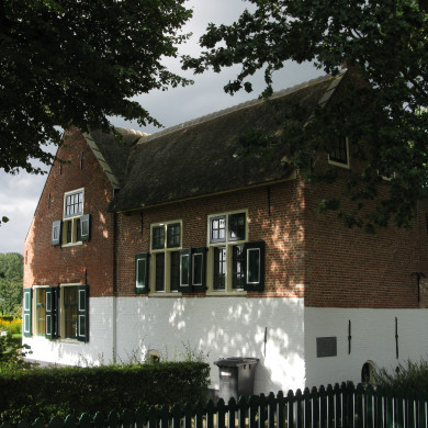 Boerderij, laag met pannen gedekt dak, haaks op elkaar staande vleugels, 17e/ 18e eeuw.