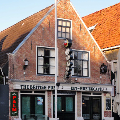 Diep pand onder zadeldak tegen rijk versierde klokgevel. De beganegrond is verdiept t.o.v. het tegenwoordige kadeniveau.