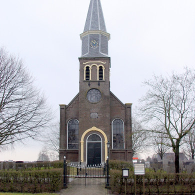 Inleiding NEDERLANDS HERVORMDE KERK, KERKHOF EN TOEGANGSHEK. Markant op een aan drie zijden door water, beukenhagen en enkele bomen omzoomd iets verhoogd kerkhof (zonder zerken) gelegen neoclassicistische zaalkerk, die in 1860 werd gebouwd.