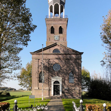 Inleiding NEDERLANDS HERVORMDE KERK, KERKHOF EN TOEGANGSHEK. Markant op een aan drie zijden door water, beukenhagen en enkele bomen omzoomd iets verhoogd kerkhof (zonder zerken) gelegen neoclassicistische zaalkerk, die in 1860 werd gebouwd. Het kerkhof is aan de wegzijde toegankelijk via een giet- en smeedijzeren toegangshek met door pijnappels bekroonde hekpalen uit de tweede helft van de 19de eeuw. In de klokkenstoel een luidklok gegoten in 1498 door Gerardus van Wou, diameter 123 cm. Het mechanisch smeedijzeren torenuurwerk is gedateerd 1602, later voorzien van elektrische opwinding. Het orgel werd vervaardigd in 1891 door de firma Van Dam te Leeuwarden. De interieuronderdelen stammen grotendeels uit de bouwtijd.