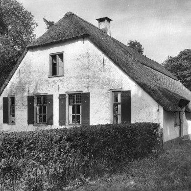 Boerderij nabij de toren gelegen, witgepleisterd langhuis.