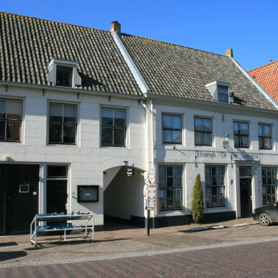 Tegenover de kerk gelegen in oorsprong 17e-eeuws PAND, onder zadeldaken tussen puntgevels, bestaande uit twee gedeelten die in elkaars verlengde liggen.