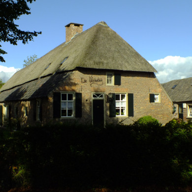 Door een bomensingel omgeven 18e eeuwse boerderij onder met riet en pannen gedekt wolfdak. Vensters met luiken en zesruitsschuiframen.