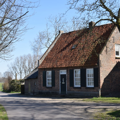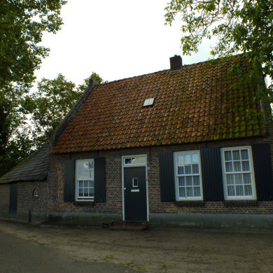 Langgevelboerderij onder pannen wolfdak, midden 19e eeuw. In het woongedeelte vensters met zesruitsschuiframen.