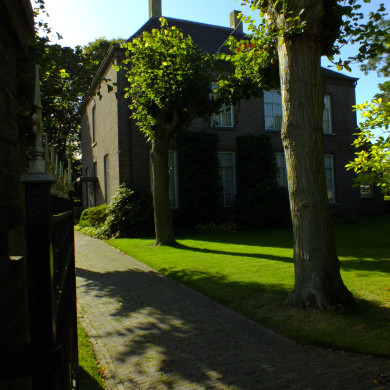 Sober bakstenen pand met verdieping en schilddak. ca.1860. Tuinhek.