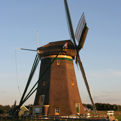 Achtkante poldermolen, kap en achtkant met riet gedekt.