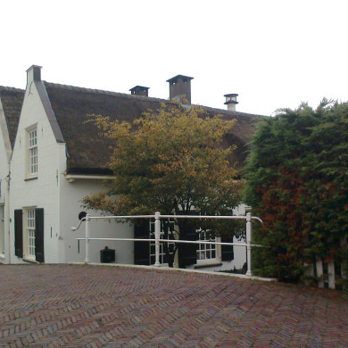 Lage woning, deels rieten dakbedekking, kleine roeden, luiken, 18e eeuw. Aardig achter en terzijde aan het water gelegen.