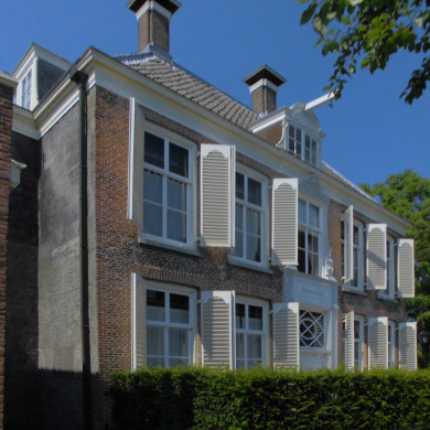 "LEEUWENDIJK", XVIIIe eeuws rechthoekig HERENHUIS, fraai gesneden dubbele deur. Middenpartij evenals ingangspartij op zijde gesneden raamomlijstingen. Overtuin aan de Vecht.