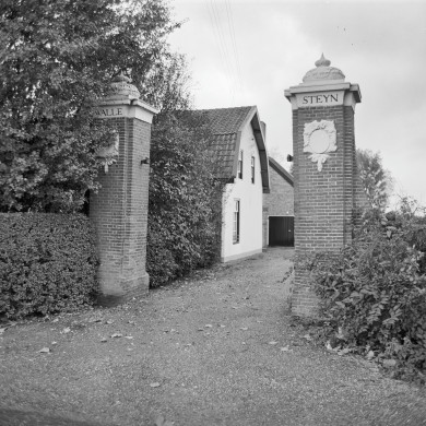 In oorsprong 18e eeuwse BOERDERIJ onder rieten zadeldak; drie 25 ruitsschuifvensters met luiken ter weerszijden, waarvan een in voorgevel en twee in rechterzijgevel; twee negenruitsschuifvensters met luiken in linkerzijgevel.