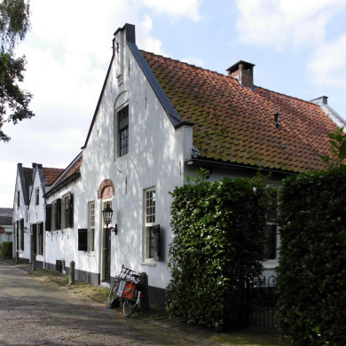 WONINGEN met wit gepleisterde gevels op een zwarte plint; aan de straatzijde topgevels waarachter zadeldaken.