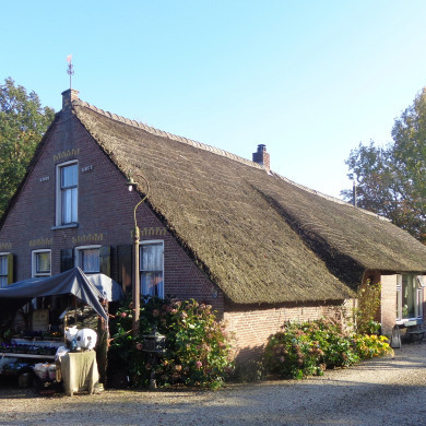 Boerderij dwarshuis, dak met riet gedekt, grotendeels 17e eeuw.