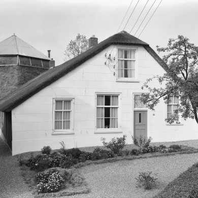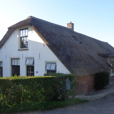 BOERDERIJ met gepleisterde gevel. Als streektype waardevol. Goede vensterindeling. De kap met riet gedekt heeft aan de voorgevel een wolfeinde.