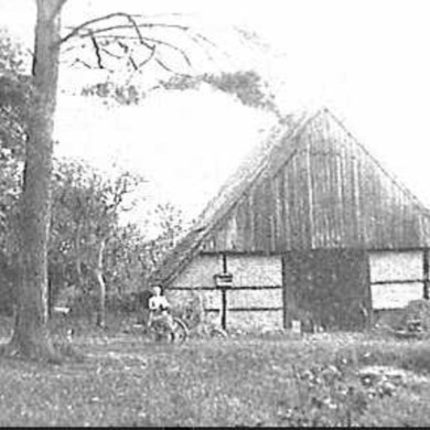 Saksische houten wagenschuur onder rieten zadeldak, wellicht 18e eeuw.