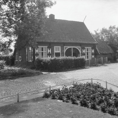 Vakwerkhuis met houten getoogde inrijpoort in de zijgevel.