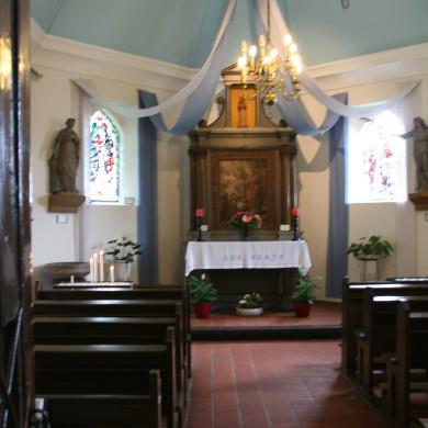 H.Kruiskapel. XVIIe eeuwse eenbeukige KAPEL met driezijdige koorsluiting; torentje op de westgevel, waarvoor een portaal is aangebouwd. Klassicistische altaarretabel (XIXa), waarin schilderij met St. Sebastiaan en St. Nicolaas en waaraan twee witgeverfde heiligenbeelden. Als kruiswegstaties veertien litho's van Turgis naar O. Tassaert, Parijs-Toulouse, vroege XIXe eeuw, met Franse en Spaanse tekst. XVIIe eeuws kruisbeeld achter in de kapel. In het portaal witte beeldjes van Antonius Abt en Barbara.