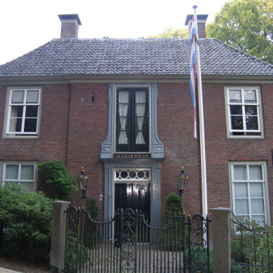 Marienhof. 18e eeuws klein buitenhuis. Versierde Louis XVI middenpartij. Tuinmuur; laag gesmeedijzeren hek.