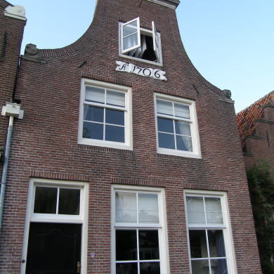 17e eeuws pand waarvan de gevel meermalen zal zijn gewijzigd; in de huidige vorm van een afgeknotte tuitgevel, afgesloten door een lijstje. Hoekvoluten en banderolle met jaartal 1687. In de XIX gewijzigde benedenbouw een XVIII voordeuromlijsting; zijposten met verdiepte velden.