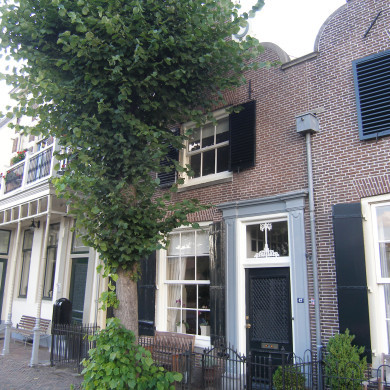 Pand met topgevel met volutenbekroning. Houten deuromlijsting, XVIII.