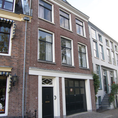 Dubbel pand met gepleisterde hoge gevel, hoge stoep, rechte kroonlijst. Schuifvensters. Omstreeks 1790.