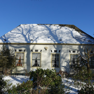 Boerderij "de Yzere Mortier". Dwarshuis gepleisterd, kleine roeden met schuiframen, 17e eeuw.