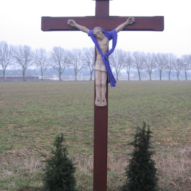 Wegkruis bij Huis Roffart met houten corpus, trant van omstreeks 1700.